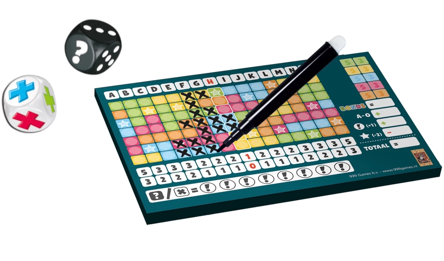 Maak steeds de juiste keuze en probeer de door de andere spelers gewenste combinatie weg te nemen. Je keuzemogelijkheden stijgen als je je speelveld verstandig uitbreidt. Naast punten voor complete kolommen krijg je ook een bonus als je alle vakjes van 1 kleur hebt aangekruist. Het spel is afgelopen als een speler 2 complete kleuren heeft aangekruist. Wie heeft de meeste punten?