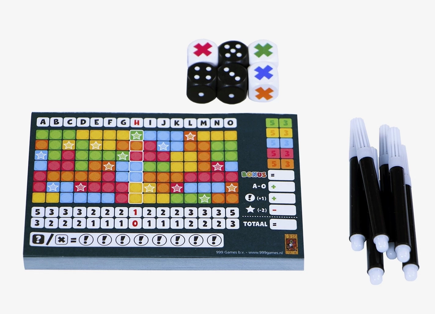 Kies steeds 2 dobbelstenen en kruis de bijbehorende vakjes op je speelveld aan. Het vullen van kolommen en gebieden van dezelfde kleur leveren een bonus op. Wie behaalt de meeste punten?