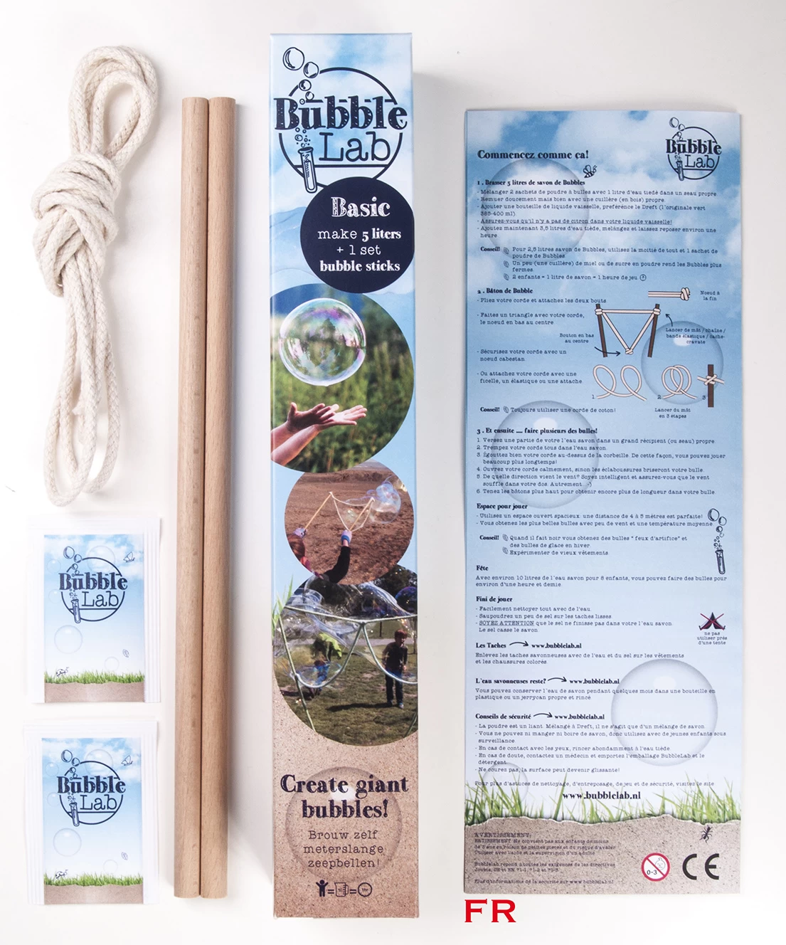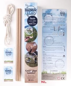 Een complete set ecologische stokken, 2 zakjes met poeder voor 5 liter sop en een ruim 2 meter lang ecologisch katoenen touwtje en handleiding in 4 talen komen uit de BubbleLab koker rollen als je hem openmaakt.