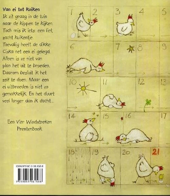Het prentenboek Mijn kuiken – Van ei tot kuiken is een fantastisch verhaal en leuk om het proces met jonge kinderen te beleven. Samen met het meisje stap je het kippenhok in en volg je Ciska de kip die in het stro een ei laat vallen. In plaats van op het ei te gaan zitten, loopt Ciska het hok uit. Het verhaal is niet goed te volgen voor kinderen en geeft het gevoel alsof je het allemaal zelf beleeft.
