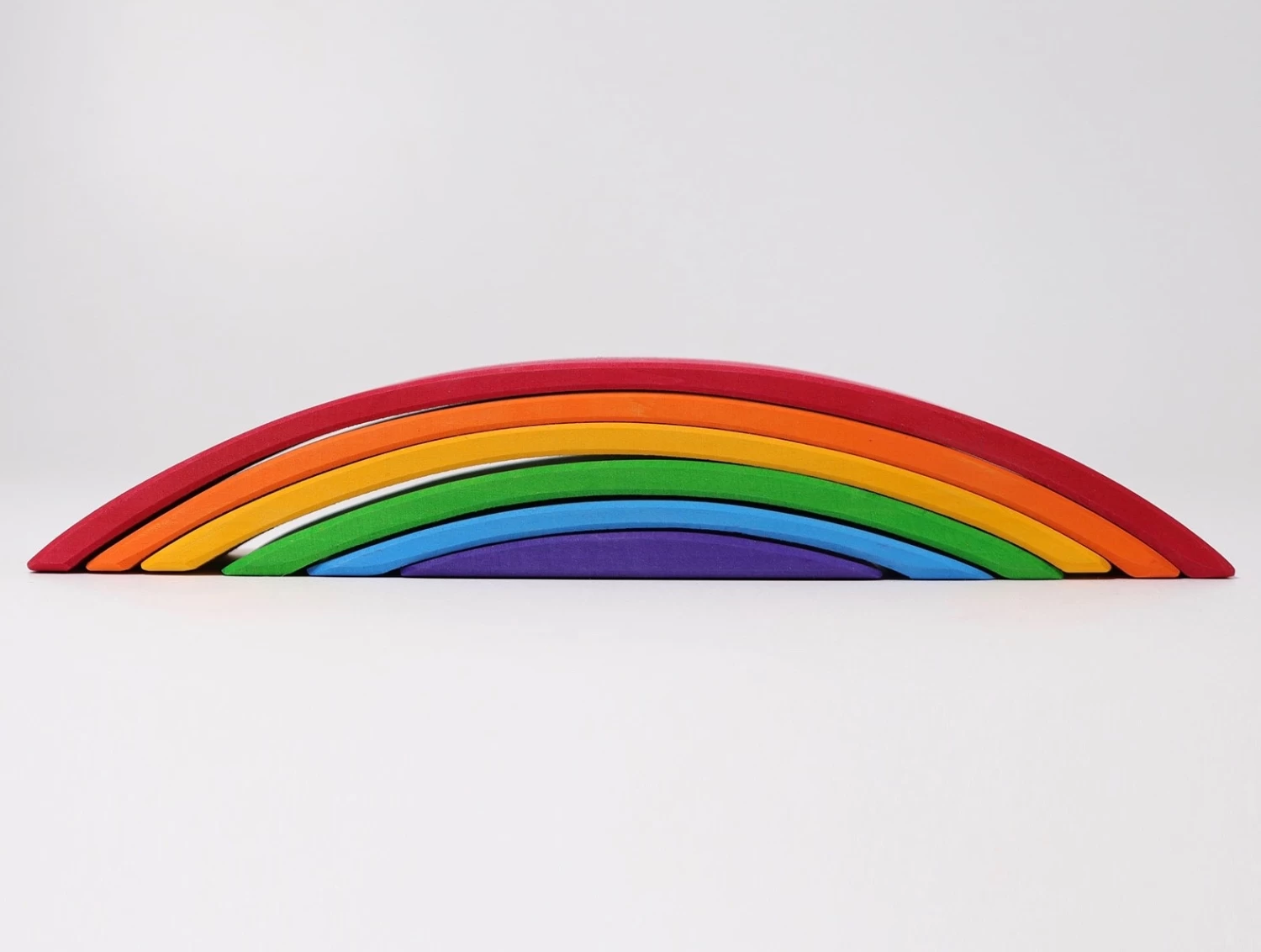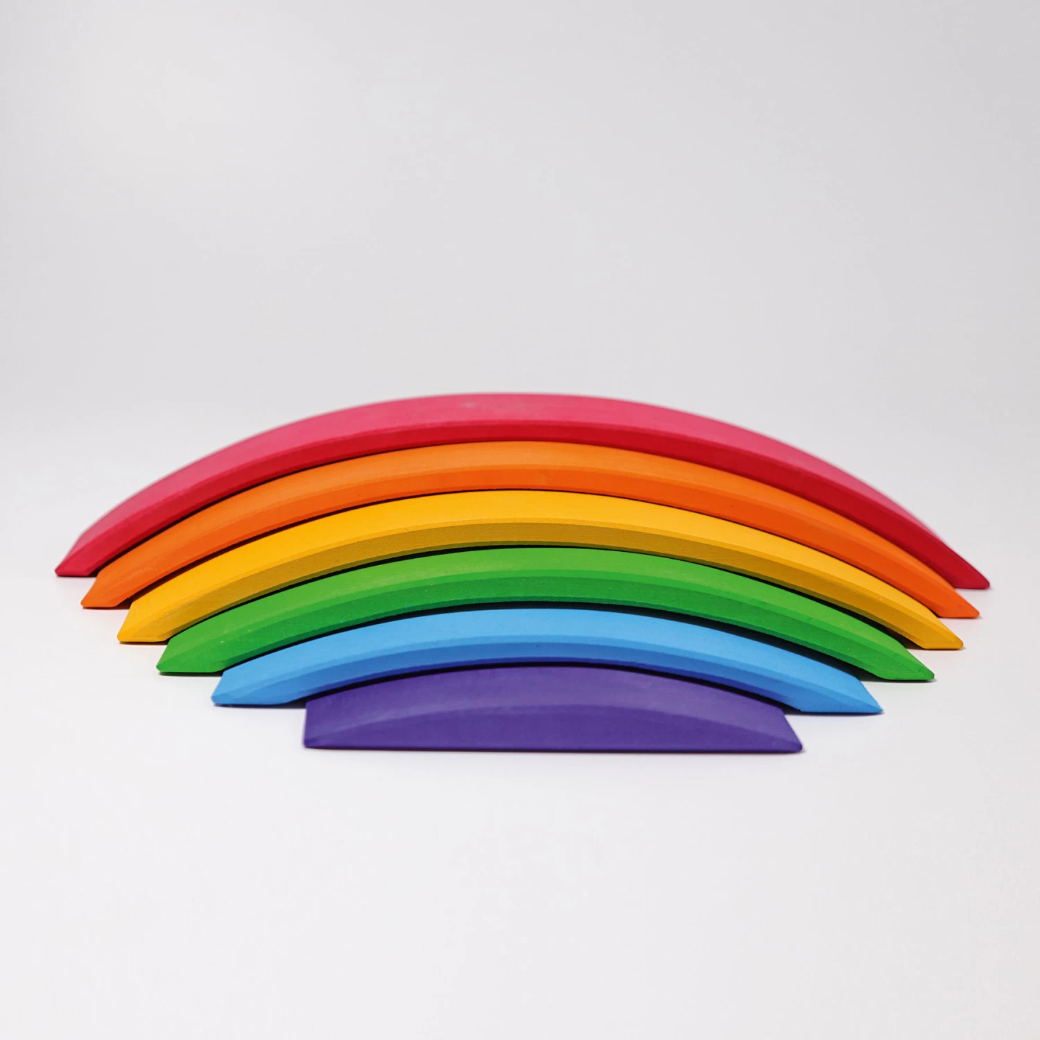 Houten, 6-delige brug in regenboog kleuren. Natuurlijk weer prachtig vorm gegeven en van mooie natuurlijke kleuren zoals je gewend bent van de Grimms kwaliteit.