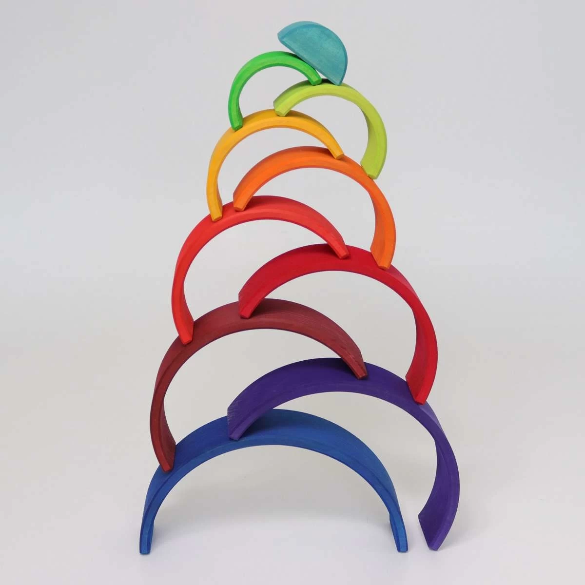 De 10-delige houten regenboog van Grimms is geen traditioneel educatief speelgoed of materiaal dat nauwkeurig is en richting geeft aan één juist antwoord maar het prikkelt de eigen fantasie en de ontdekkingstocht in het rijk der getallen.