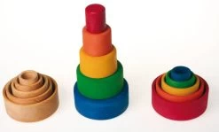 Kinderen leren bakjes te stapelen, groot en klein herkennen, iets in een bakje plaatsen, het eruit halen of verstoppen. Deze vrolijk gekleurde bakjes van het houten speelgoedmerk Grimms maken dat kinderen zich veel vaardigheden eigen maken. Maar buiten dat het leerzaam is voor hele jonge kinderen om te spelen met bakjes, pannen en potten en vooral een combinatie daarvan, is het vooral erg leuk!