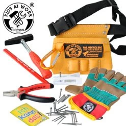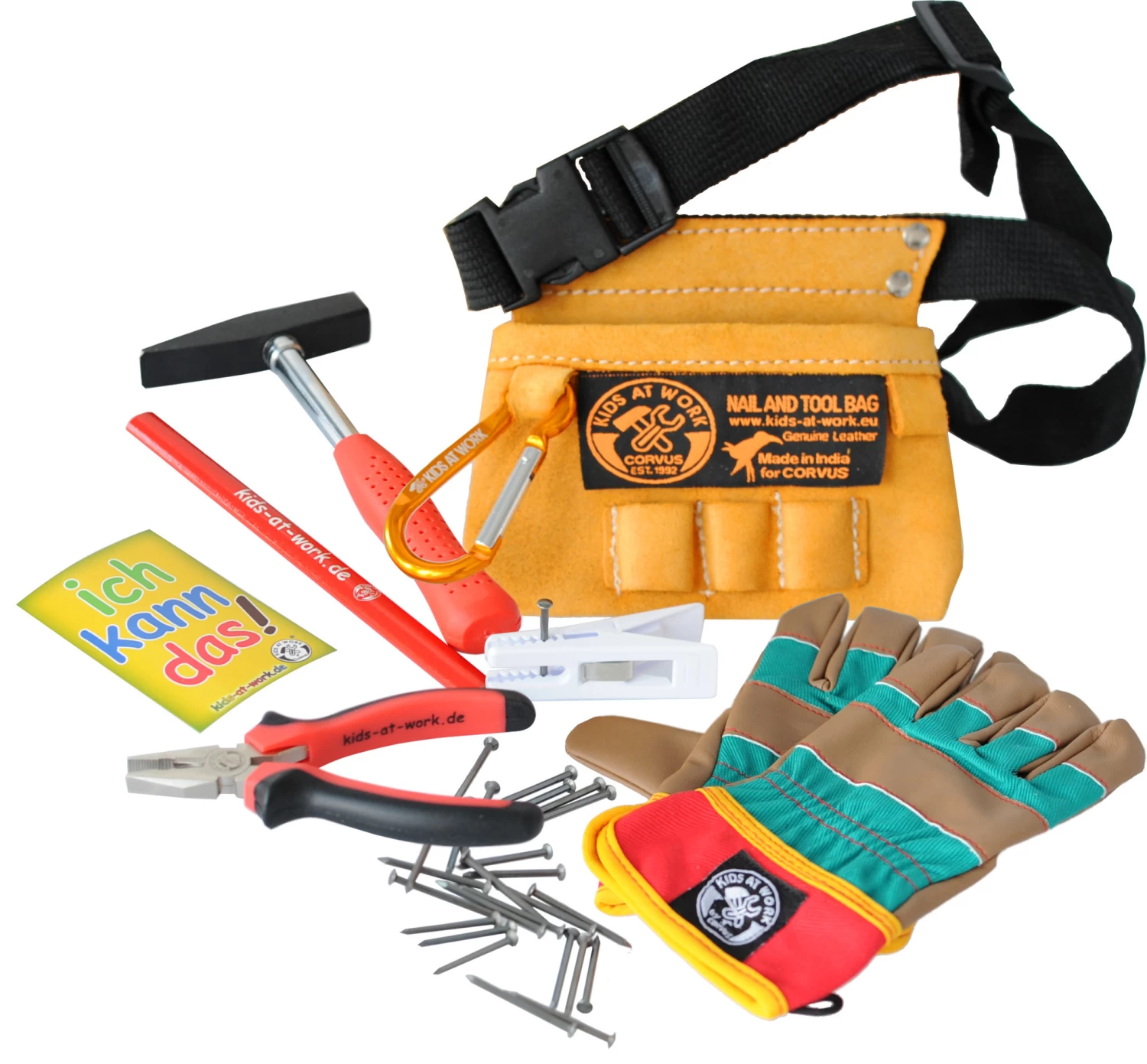De leren gordel is gevuld met spijers en een fijne penhamer, Ideaal voor de at jongere kinderen. Met de handschoenen lijken ze natuurlijk heel stoer en past in een ‘verkleed’ verhaal. Dus laat de fantasie maar stromen!