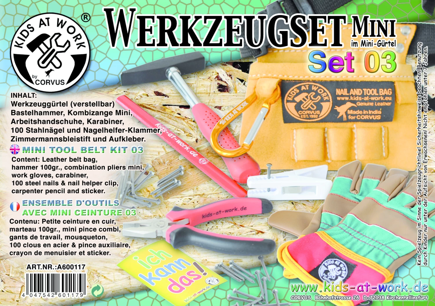 De handschoenen in deze set, de spijkers en het potlood. Zo verbinden kinderen zich met de wereld van het klussen zoals ook papa of mama aan de slag gaan. Want goed gereedschap is het halve werk.