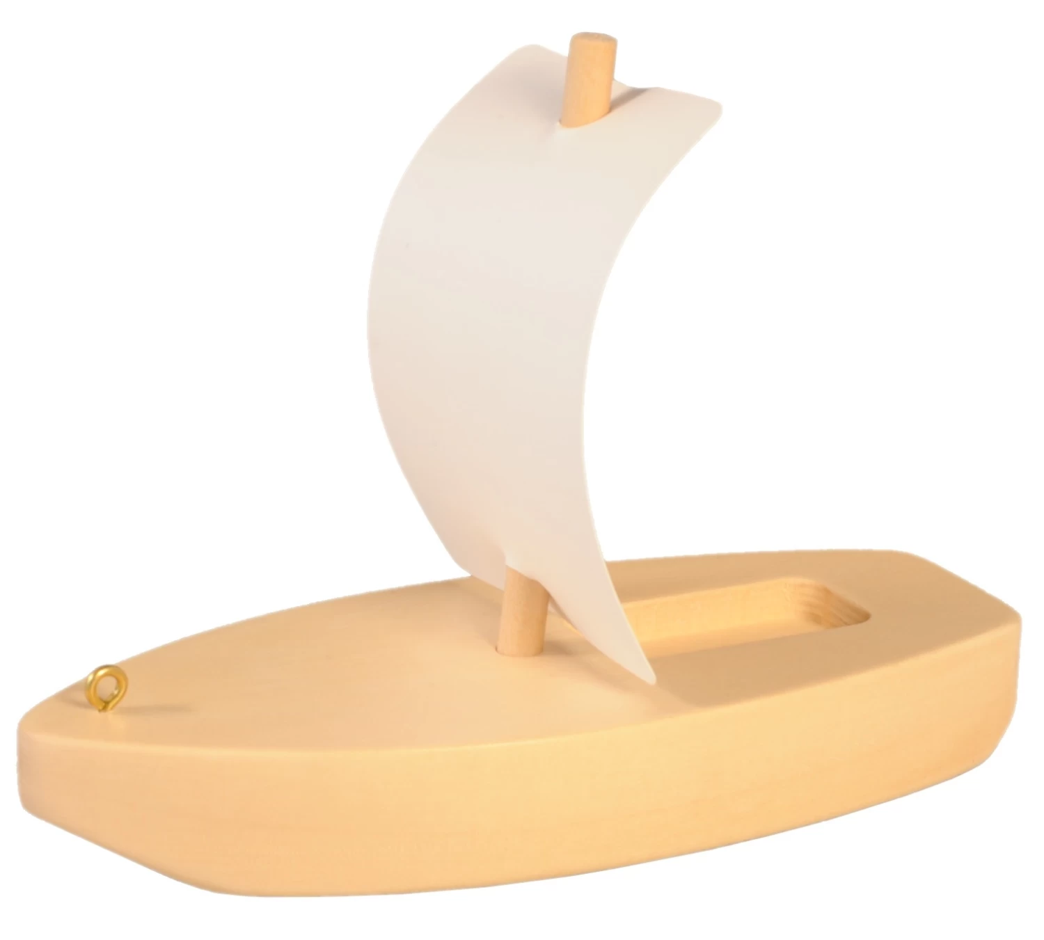Het houten zeilbootje heeft ook nog een oogje om een touwtje door te doen als aanleglijn of trekkoord.