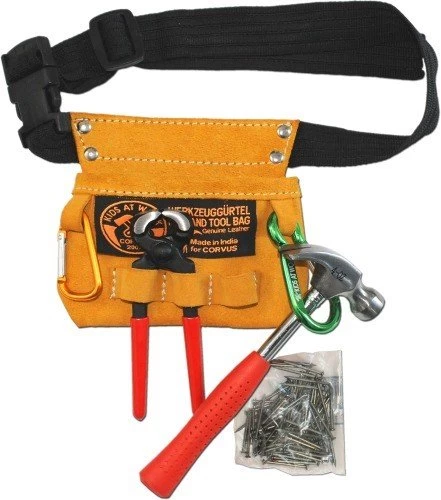 In het leren tasje geschikt voor kleinere kinderen tot een jaar of 9 of 10 zit een mini nijptang, een kleine timmermanshamer/klauwhamer en een zakje spijkers met een grote en een kleine karabijnhaak voor praktische bevestiging van (eventueel ander) gereedschap.