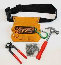 Met deze lederen gereedschapsgordel heeft je kind altijd gereedschap binnen handbereik. Prima om spijkers in op te bergen en je hamer op te hangen.