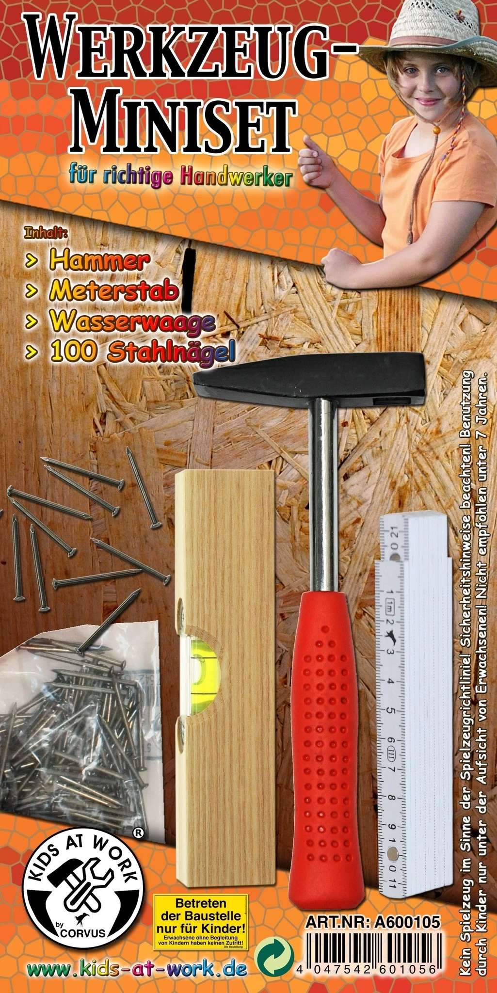 De set bevat spijkers, een penhamer, een duimstok en een waterpas. Alles lekker handzaam!