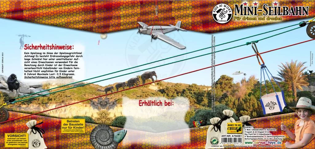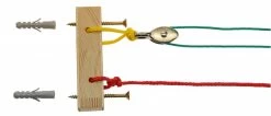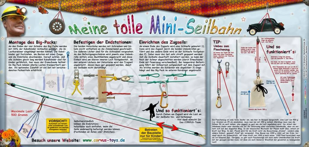 Inhoud van deze kabelbaan : 2 mini katrollen, 2 mini karabijnhaken, 2 bevestigingsblokken, touw (totaal 12 meter) 0,4 mm dik, diverse toebehoren.