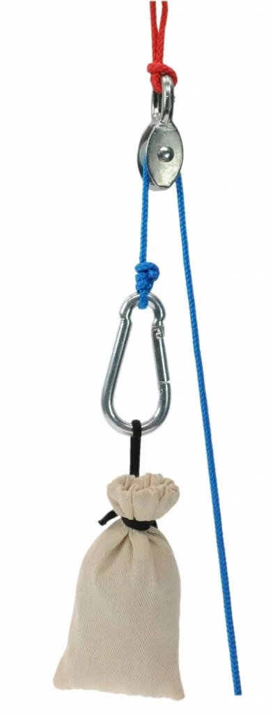 Deze mini katrol is echt hijsspeelgoed. Bij OpzijnPlek verkopen wij ook een kleine takel om binnen mee te spelen Deze katrol bestaat uit een kleine karabijnhaak, 3 meter touw van 3 mm dikte en een bevestigingstouwtje met 2 katoenen zakjes 5 x 10 cm. Door het zakje te hijsen voel je kracht en kleer je zonder enige moeite meer over gewichten door te takelen.