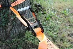 Bind de slack-line tussen twee bomen in of bevestig hem aan palen. Voor bomen kun je ook een <a