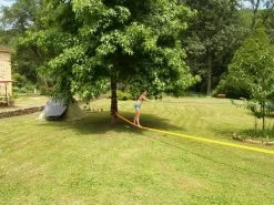 Boombescherming raden we wel aan. Een oude handdoek of deken volstaat ook prima! De slackline is 17,5 meter en het is de bedoeling dat je probeert over de lijn te balanceren en de overkant te halen zonder te vallen. Slacklinen is een sport en een spel van coördinatie, concentratie en balans.