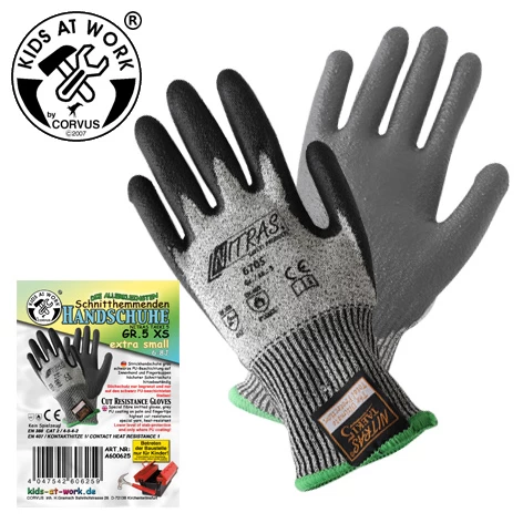 Super handige beschermende handschoen in maatje XS 5, een kleine handschoen voor jonge klussers vanaf ca. 6 – 8 jaar. Want andere handschoenen zijn vaak te groot. Soms al te gebruiken vanaf 4 en 5 jaar want de handschoen rekt mee en is strakker dan menige andere handschoen voor jonge handenarbeiders.