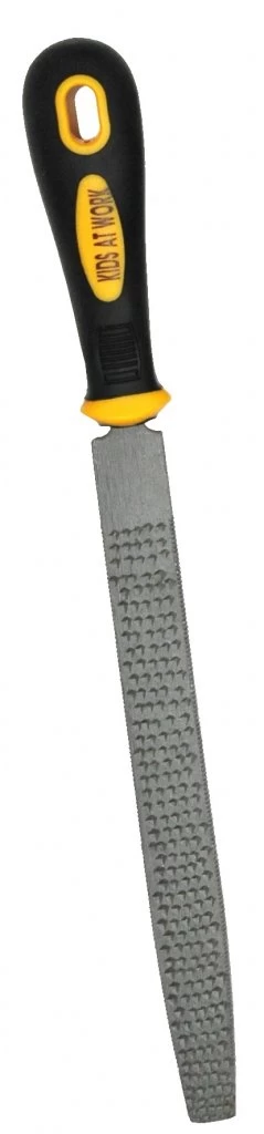Kids at Work is een stoer merk kindergereedschap. Inmiddels hebben we al heel veel ergonomisch gereedschap voor de kinderhand in ons assortiment en omdat we natuurlijk ook speksteen sets verkopen is daarbij deze rasp een prima alternatief voor de professionele Talcus raspen. Met deze vlakke rasp kun je ook prima houtwerkstukken bewerken. Onze filosofie is dat als een kind werkt met echt gereedschap dat ook de motivatie om een werkstukje af te maken groter wordt, omdat het gereedschap ook echt werkt. Plastic gereedschap en nagemaakt gereedschap bereikt niet de graad van interesse die gewoon realistisch kindergereedschap met ergonomische grepen en gemaakt voor de kinderhand doet.