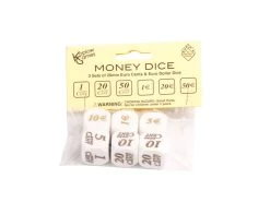 Set van zes dobbelstenen. Een dobbelsteen bevat de 0,05, 0,10, 0,20 0,50 cent inclusief 1 en 2 euro. De tweede dobbelsteen bevat alleen euro’s, namelijk 1,2,5,10,20 en 50. Je ontvangt er van elke soort 3.