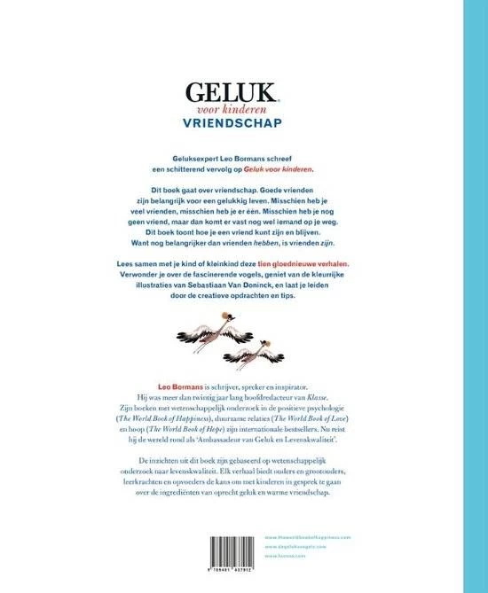 Gedeeld geluk is dubbel zo leuk schrijft Geluksexpert Leo Bormans. Goede vrienden zijn belangrijk voor een gelukkig leven. Misschien heb je veel vrienden, misschien heb je er één. Misschien heb je nog geen vriend, maar dan komt er vast nog wel iemand op je weg. Dit boek toont hoe je een vriend kunt zijn en blijven. Want nog belangrijker dan vrienden hebben, is vrienden zijn. Lees samen met je kind of kleinkind deze tien gloednieuwe verhalen. Verwonder je over de fascinerende vogels, geniet van de kleurrijke illustraties van Sebastiaan Van Doninck, en laat je leiden door de creatieve opdrachten en tips.