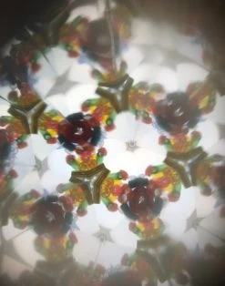 Door de reflecties in de spiegels in de kaleidoscoop zie je figuren en die zien eruit als een symmetrisch mandala-achtig patroon, dat dan door het schudden met de caleidoscoop kan veranderen.