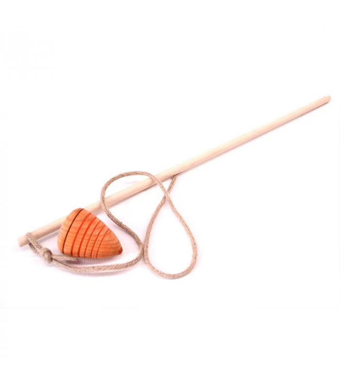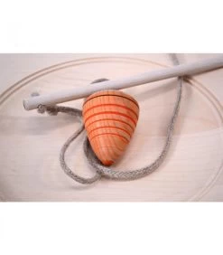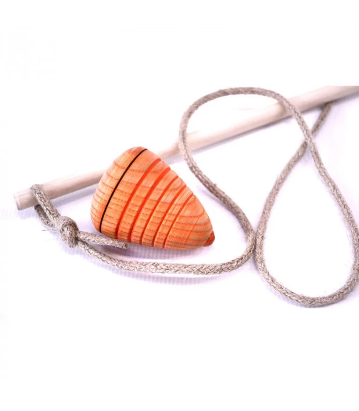 Historische houten gyro-tol aangedreven door een zweep voor in de open lucht, in een traditionele vorm gemaakt van essenhout. De tol wordt in assortiment geleverd in een aantal uni-kleuren. Helaas weten we niet welke wij krijgen, dus de kleur is een verrassing.