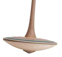 Materiaal: Esdoorn houten tol voor twee handen met notenhandvat, streepdecor in een breed scala aan kleuren.