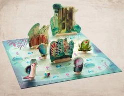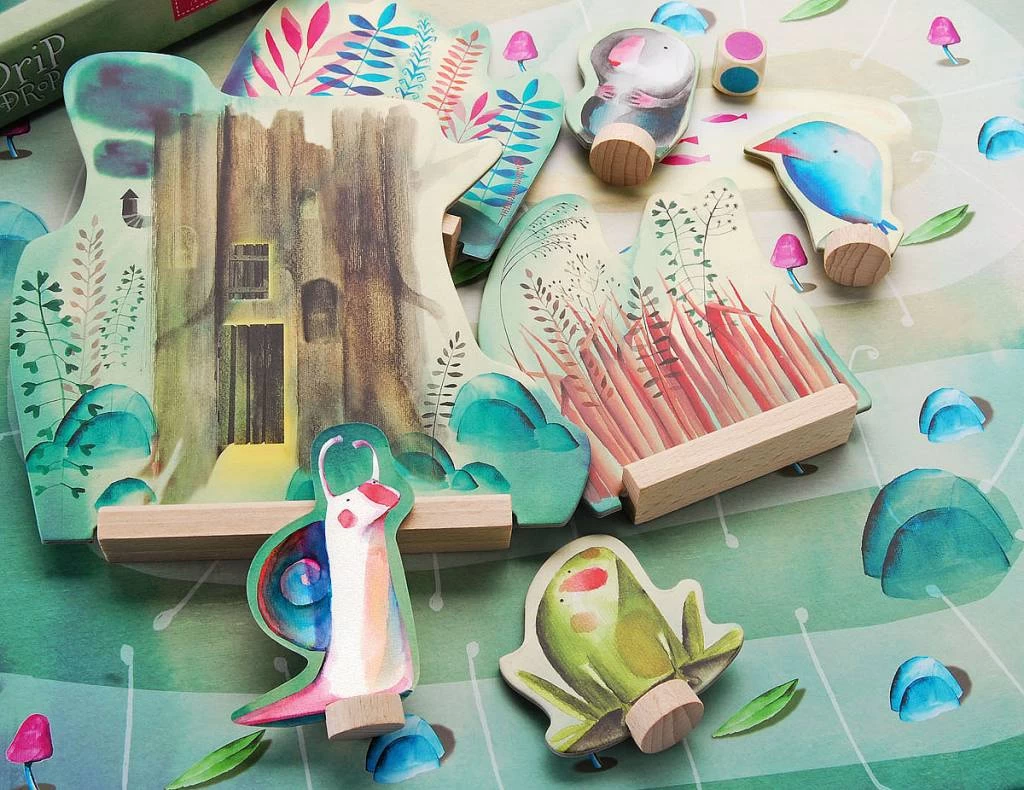 Inhoud: 1 spelbord, 4 verschillende pionnen, 1 boomstamhuisje, 2 schuilplaatsen met gras en bloem, 1 dobbelsteen met gekleurde stippen.