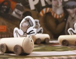 1 spelbord, 5 x 6 kaarten, 5 houten auto’s met coureur, 5 hindernissen, 1 beker