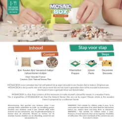 MOSAICBOX is een compleet doe het zelf pakket om je eigen mozaïek in een houten lijst te maken. Origineel aan MOSAICBOX is dat je werkt met echt natuursteen dat met de hand is gesneden door echte mozaïek kunstenaars. Dit is een leuke en leerzame activiteit voor kinderen en volwassenen.
