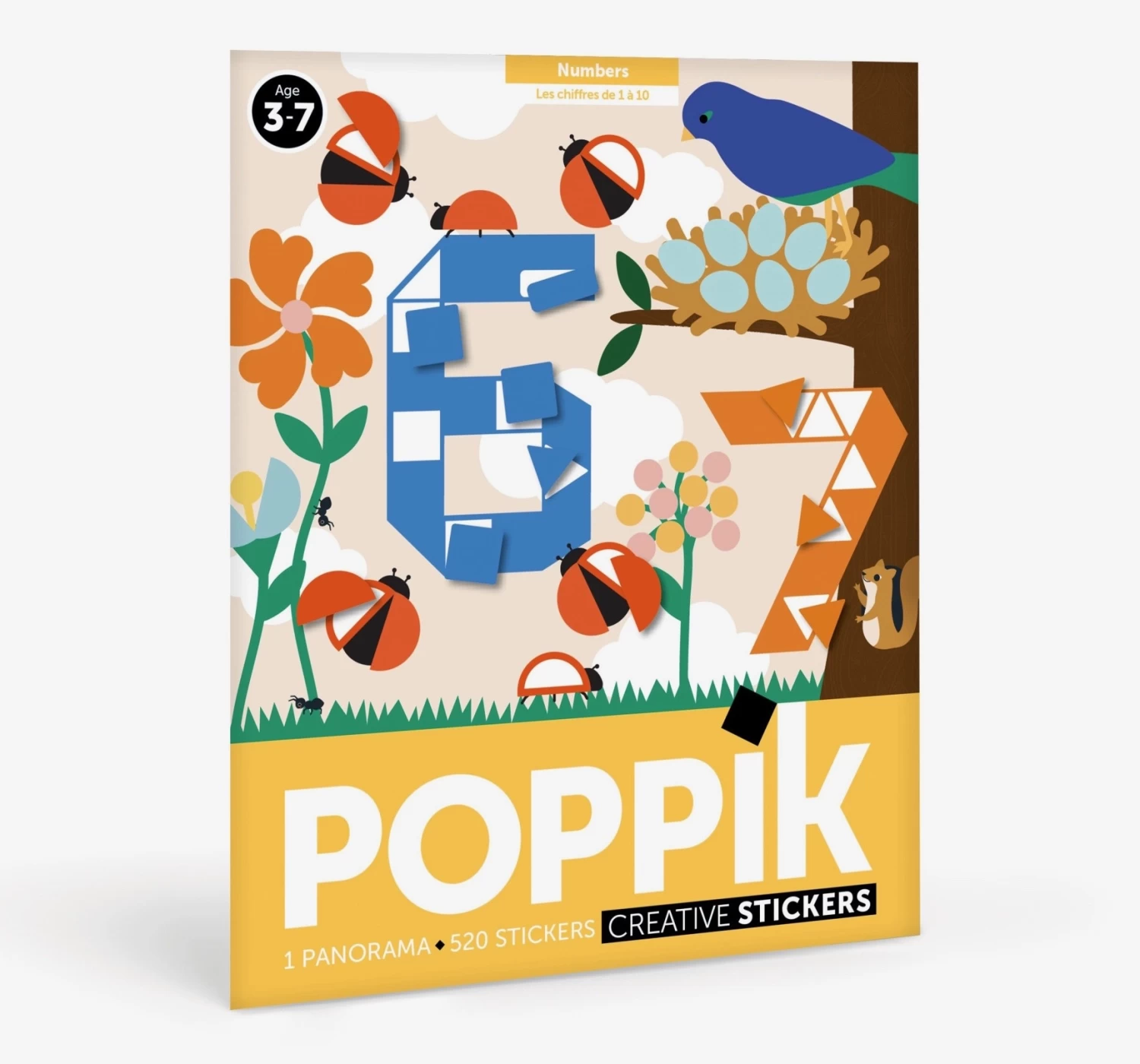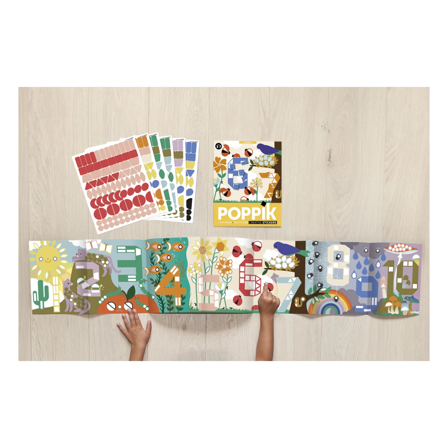 Hier vind je een zeer creatieve manier om tot 10 te leren tellen! Elk figuur wordt geassocieerd met een element van de natuur: 1 zon, 2 cheeta’s, 3 rupsen, 4 vissen, 5 madeliefjes … Het kind ontvouwt de prachtige poster en plakt de geometrische stickers op het grote decor in de aangegeven kleuren. Eenmaal voltooid, kan de grote sticker-poster aan de muur worden gehangen om de kamer te versieren.