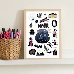 Met deze educatieve poster met stickers raken kinderen gepassioneerd door allerlei onderwerpen die met zwart te maken hebben. De posters zijn er in vele kleurthema’s en steeds ook met een specifiek thema dat weer past bij de kleur. In dit geval kleur zwart. Spaar alle kleuren en plak de stickers zelf op een A4-poster die de kamer dan kan sieren.