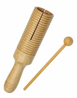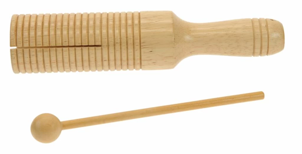 Een Guiro is een slagwerkinstrument waarop je ook een raspend geluid kunt maken.