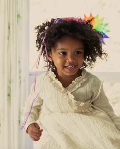 Zijden frisse bloesem tinten elastische band ‘Blossom’ met een staart van linten vastgezet met een klein roosje. Wat je maar wilt, kun je worden, een dansende ballerina, een toverfee, of prins op het witte paard. Met deze krans kun je alles spelen wat je wilt en vooral jezelf zijn! Combineer met de doeken en zet vast rondom hoofd en taille met deze elastische banden.