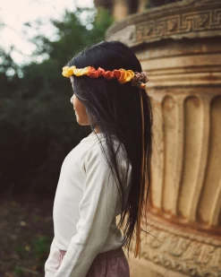 Zijden aardetinten elastische band ‘Desert’ met een staart van linten vastgezet met een klein roosje. Wat je maar wilt, kun je worden met deze haarband, een dansende ballerina, een toverfee, of prins op het witte paard. Met deze krans kun je alles spelen wat je wilt en vooral jezelf zijn! Combineer met de doeken en zet vast rondom hoofd en taille met deze elastische banden.