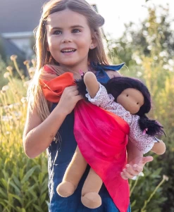 Deze speeldoeken zijn van 100% zachte zijde en geverfd met natuurlijke, non-toxische verf. Heerlijk om mee te spelen. Wij raden aan de stof met de hand te wassen, dan blijft de kwaliteit van deze stof zeer lang goed. Kinderen vinden het vaak zeer leuk om te helpen met het handwassen of het helemaal zelf te doen: de textuur van de stof verandert door het water en dat is natuurlijk erg interessant!
