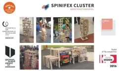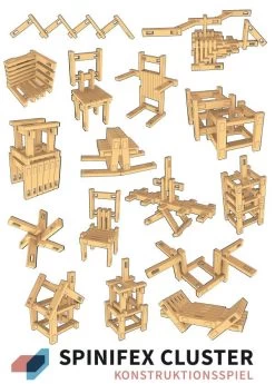 SPINIFEX CLUSTER is houten constructiespeelgoed bestaande uit 20 cm houten plankjes met uitsparingen die moeiteloos en intuïtief met elkaar kunnen worden verbonden door middel van een steekverbinding. Met SPINIFEX CLUSTER kunnen kinderen hun eigen stevige houtconstructies creëren, hun creativiteit stimuleren en het zelfvertrouwen vergroten. Stevig genoeg om zelfs op te kunnen zitten of staan. Vanwege deze bijzondere eigenschappen en de onbeperkte diversiteit aan ontwerpen die kunnen worden gemaakt, wordt het bouwspel Spinifex zeer gewaardeerd door opvoeders en graag gebruikt.