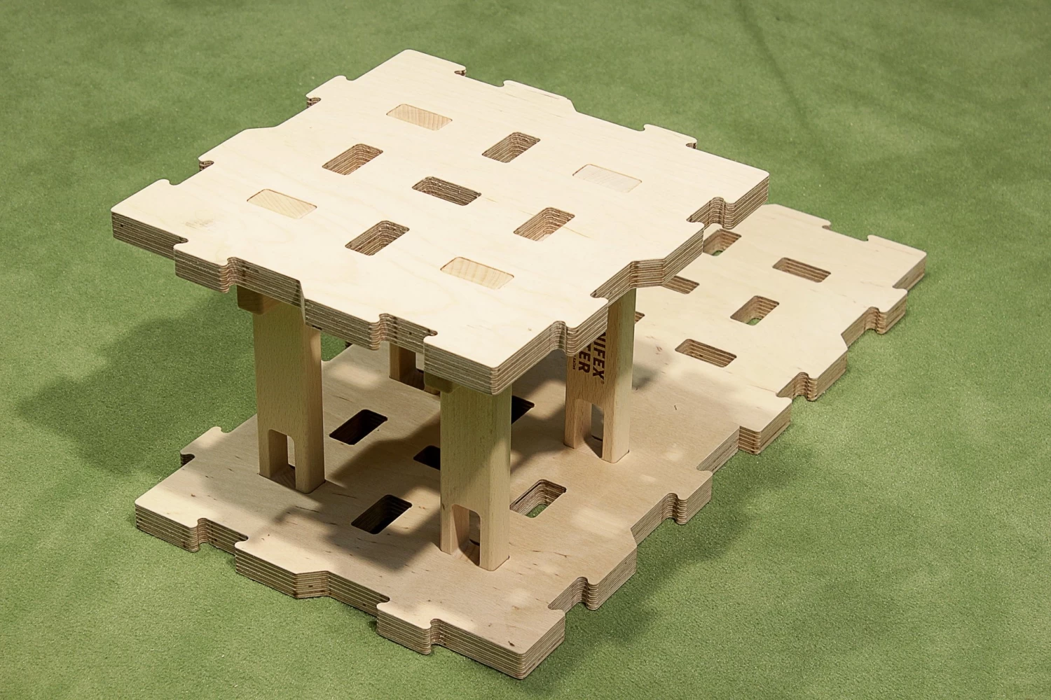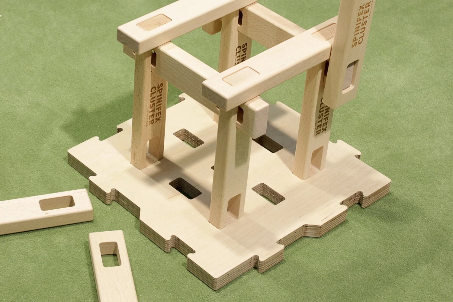 Voordeel van Spinifex Cluster is dat je net als bij Kapla met bouwplankjes kunt bouwen, maar deze steek je ook in elkaar, waardoor diagonaal bouwen ook mogelijk is. En het zit gelijk vast dus bouw je tevens stevige constructies.