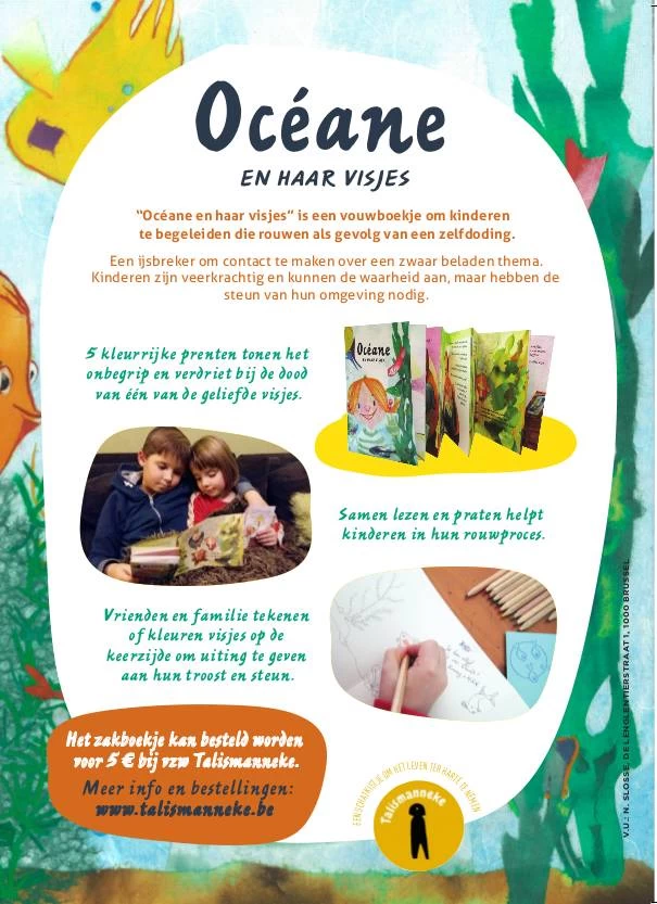 In dit kleine opvouwbare prentenboek staat het verhaal van Océane en haar vissenvriendjes. Het boek geeft een troostvol verhaal over omgaan met zelfdoding van een dierbare. Het boekje kan worden uitgevouwen en de achterkant kan ingekleurd en beschreven worden. Zo kunnen kinderen hun eigen boekje vol warmte en lieve woorden altijd bij zich dragen.