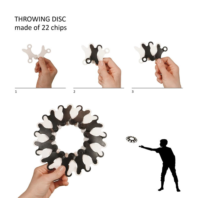 Super uitdagend constructiemateriaal dat vooral ronde vormen maakt. Iets gebogen zijn de constructiechips die je in elkaar klikt. Daarmee maak je ronde vormen en kun je bijvoorbeeld een eigengemaakte frisbee of voetbal maken. En geloof het of niet! Je kunt er echt mee ballen, gewoon binnen of buiten op straat.