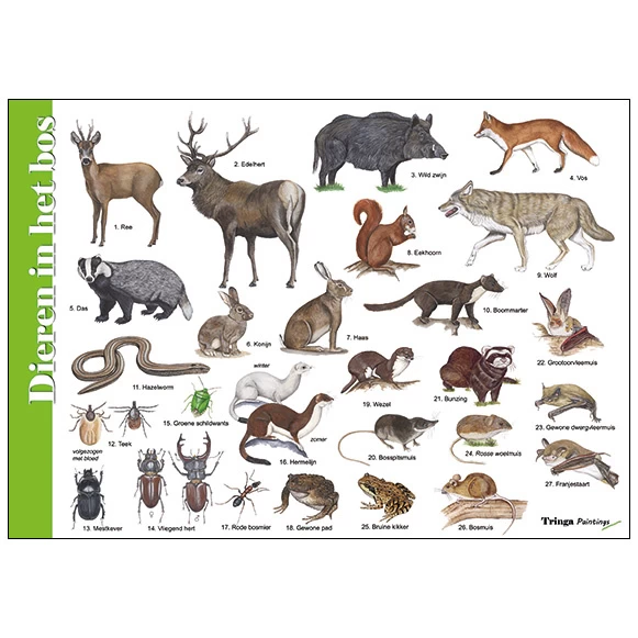 Op deze prachtig geïllustreerde herkenningskaart / zoekkaart op A4 formaat staan de meest voorkomende bosdieren die je tegen kunt komen. In de stilte van het bos, tref je zomaar een ree, edelhert, wild zwijn, maar ook hazelworm en mestkever. Met deze kaart leer je de dieren kennen en herkennen. Op de achterzijde vind je van elk dier op de kaart ook meer informatie.