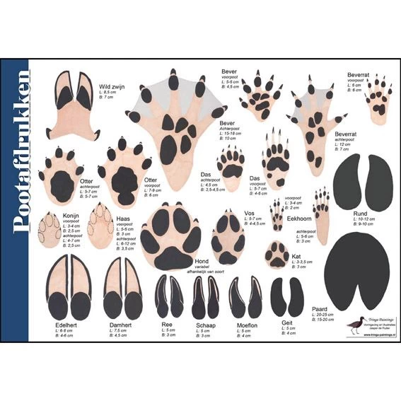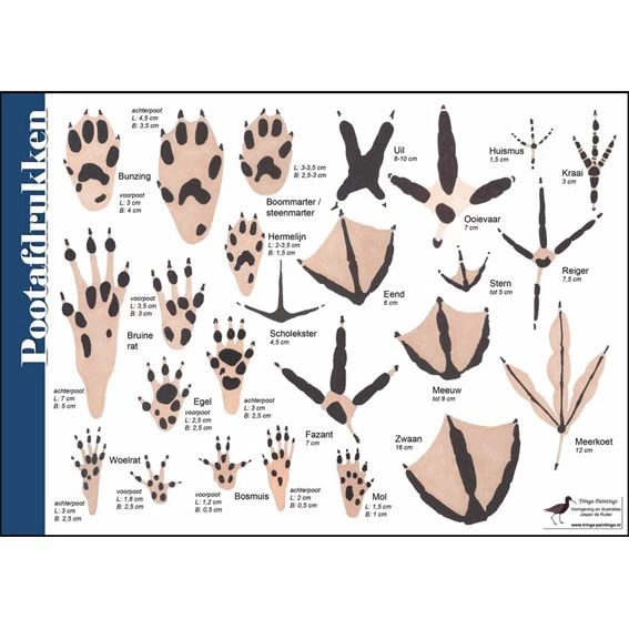 Met deze herkenningskaart natuur pootafdrukken kan jij precies zien welk dier waar naar toe is gegaan, of waar het vandaan komt! 39 Pootafdrukken van verschillende dieren. Welke zie jij in jouw omgeving?