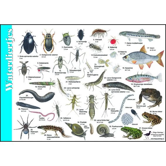Welke waterdiertjes zitten bij jou in de sloot? Ontdek hoeveel verschillende kleine en grote waterdiertjes er bestaan, hoe ze eruit zien en hoe ze leven. Sommigen hebben een hoog kriebelgehalte met veel pootjes zoals bijvoorbeeld de Zoetwaterpissebed anderen zijn alleen voorzien van een romp zoals de Platworm en Paardenbloedzuiger. Leer ze allemaal kennen op deze Waterdiertjes kaart!