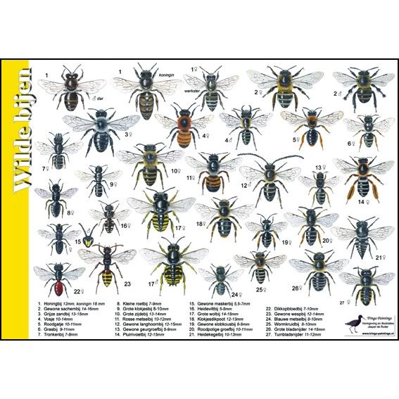 Op deze kaart staan maar liefst 27 verschillende soorten wilde bijen! Soms is het verschil tussen deze bijna niet te zien. Doordat ze gedetailleerd zijn getekend kan je die verschillen wel zien op de kaart. De kaart vertelt je ook wanneer de vliegperiode is en waar ze leven.