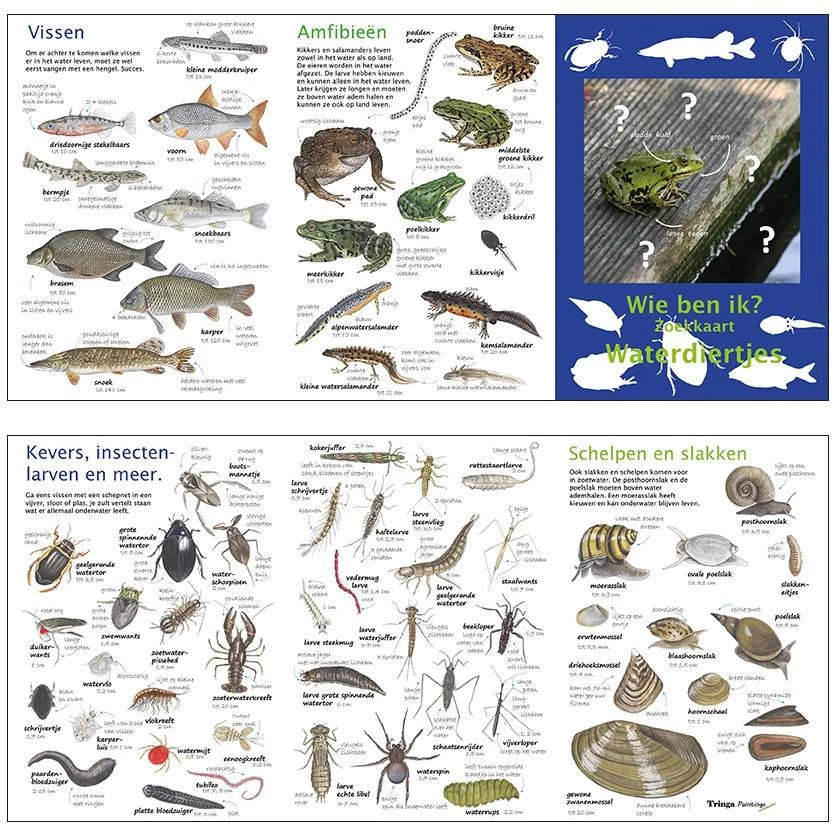 Met een klein schepnetje en een emmertje naar de sloot, of gewoon met het blote oog: rond het water is altijd van alles te vinden en te zien. Met de handzame inklapbare zoekkaart leer je alle dieren (her)kennen en benoemen! Leer over slakkeneitjes, larves, watersalamanders en vissen! De kaart is prachtig geïllustreerd en voorzien van interessante details waardoor je de dieren echt leert kennen!