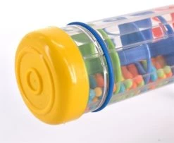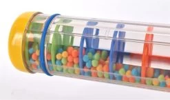 De grote regenmaker klinkt alsof de regen valt op de bladeren in een bos, of elders in de natuur als je hem omdraait. Een kleurrijke regenboog van druppelend vallende balletjes creëert een fascinerende combinatie van kleur en geluid bij het schudden van de grote rainmaker en prikkelt daarmee alle zintuigen – en het mooiste is: niemand wordt nat!