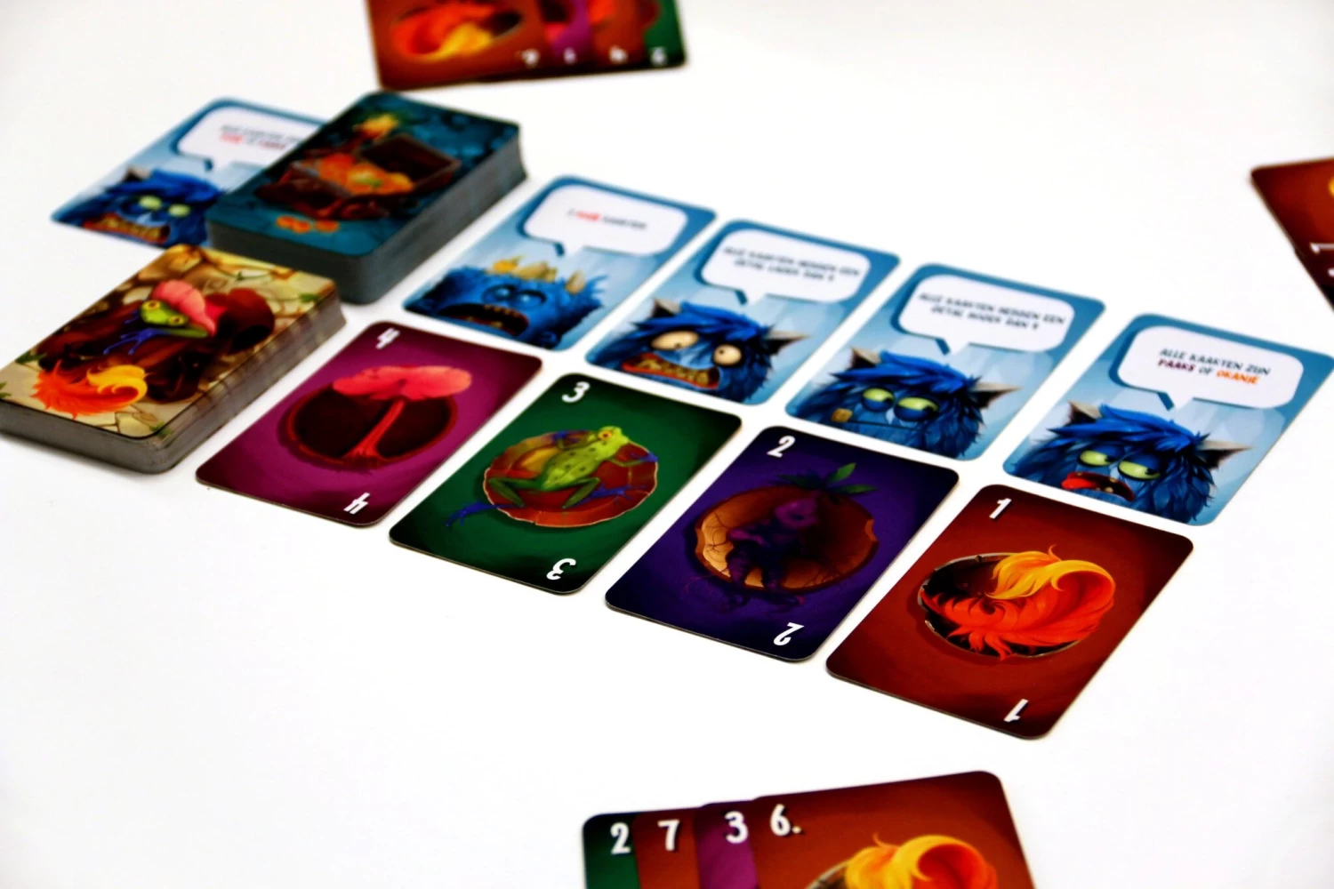 Cahoot betekent zoiets als onder één hoedje spelen. En dat doe je zeker want in Cahoots staat samenwerking centraal! Voldoe aan de opdrachtkaarten met 4 kaarten die in 4 stapels naast elkaar liggen. Let op: Je mag alleen kaarten spelen die matchen met de kleur of het nummer van de voorgaande kaart op de stapel. Werk samen en voltooi alle opdrachten zonder te bespreken wat elke speler op hand heeft. Kunnen jullie alle stapels paars of oranje maken? Of de waarde van alle kaarten precies 10 maken?
