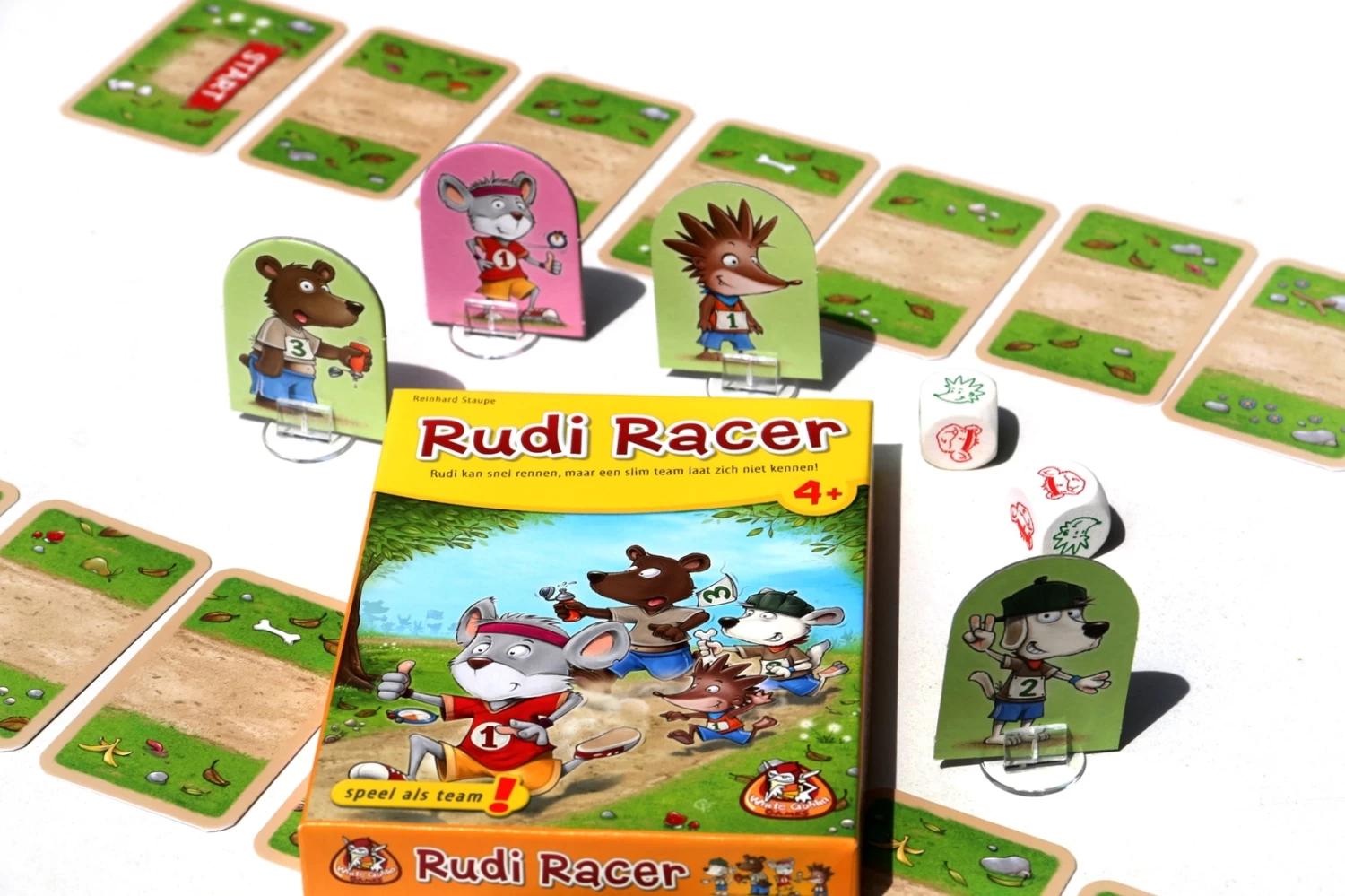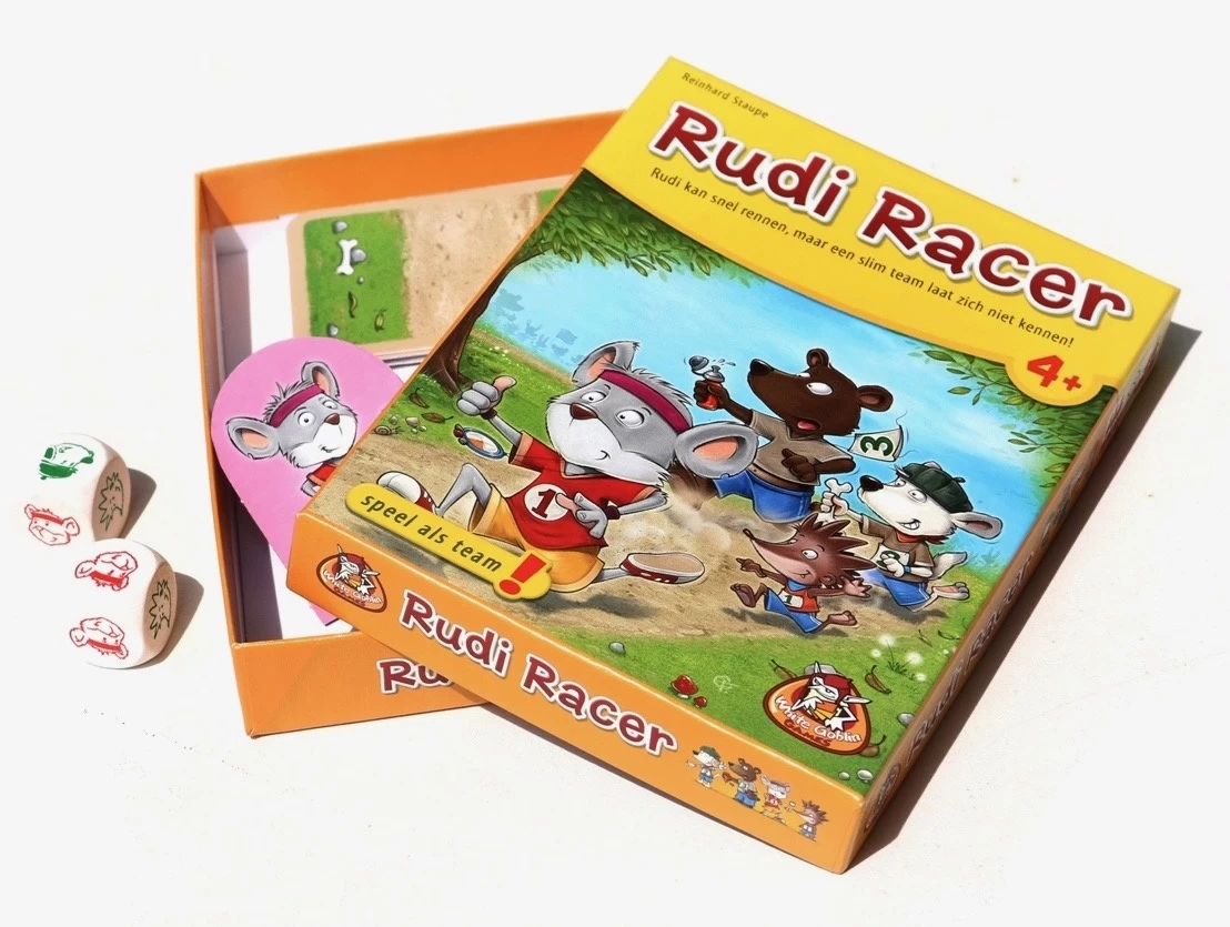 Het samenwerkingsspel Rudi Racer van het Nederlandse spellenmerk White Goblin Games is in dit geval een coöperatief racespel. De spelers vormen samen een team (egel, hond en beer). Ze nemen het op tegen Rudi Racer. Rudi is snel en kan de finish gemakkelijk als eerste bereiken. Jullie team zal dus slim moeten zijn om de race te winnen! Een uitdagend en kortdurend kaartspel waarin je samenwerkt.